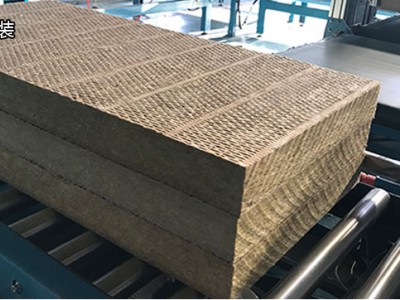 产品切割后经高风吹渣后平行重叠,使其达到包装厚度,经全自动热缩包装机,把岩棉板整体包装,经过热收缩机使包装收缩,冷却后由成品运输车运输至成品库存放。