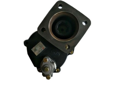 侧取力器系在变速箱侧取力窗口通过变速箱中间轴上的高挡齿或倒挡轴上的倒挡齿取力。在汽车取力器中使用最为广泛。 总体结构:有一轴式、两轴式、三轴式、带副箱式、单操纵双输出式和双操纵双输出式等几种形式。其中以两轴式结构最为普遍;一轴式结构最为简单;三轴式主要用于输出有双速异向用途的取力器,如越野车绞盘取力器;也有原为一轴式或两轴式后为改变输出轴旋向而增加一轴新成为两轴式或三轴式;带副箱式主要是在原取力器基础上进一步增速或减速,以扩展其使用性能;单操纵双输出式的两输出可同轴也可不同轴,但由同一操纵机构同时控制;双操纵双输出式的两输出可同轴也可不同轴,但由不同的操纵机构独立控制。