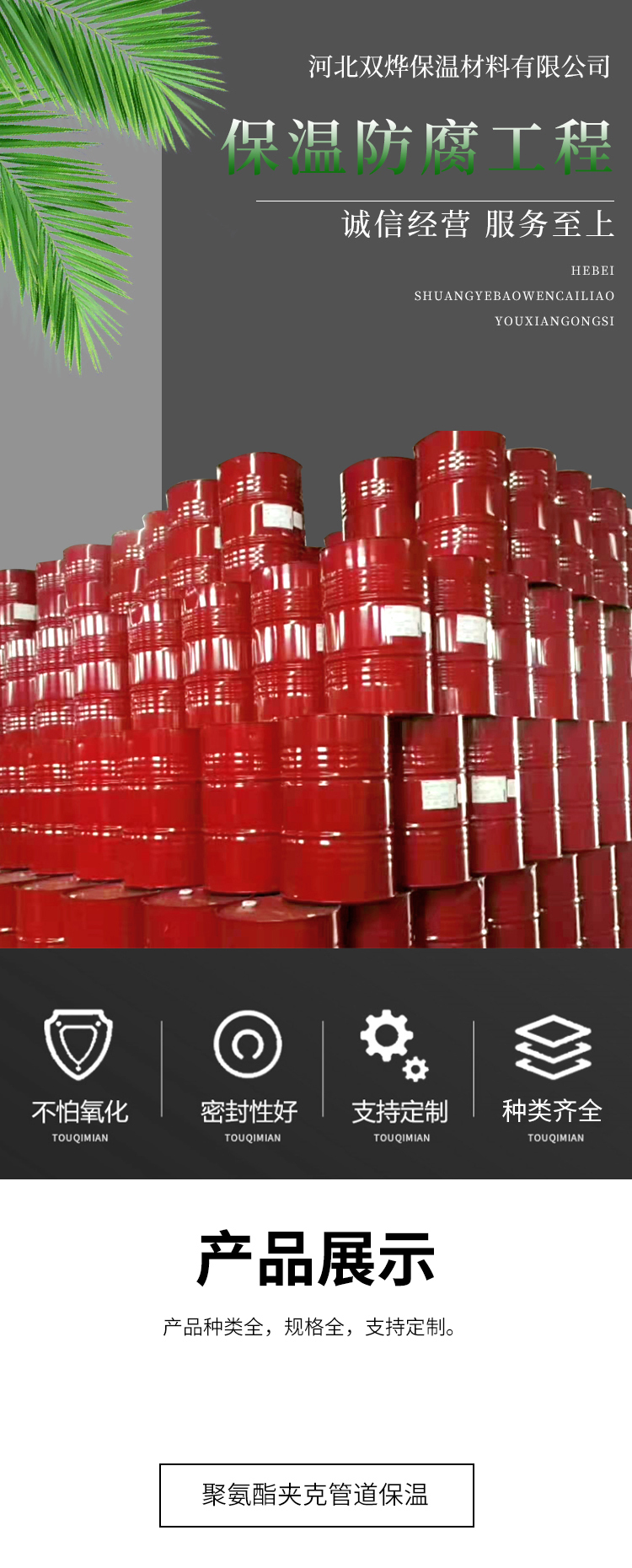 4、无氟发泡,适应环境宽;可用于冷藏车、贮罐、管道、冷库、啤酒发酵罐、保鲜桶的绝热保温保冷、房屋建筑绝热防水。