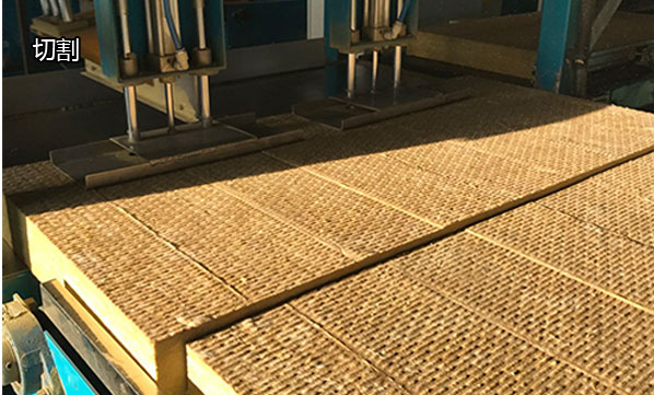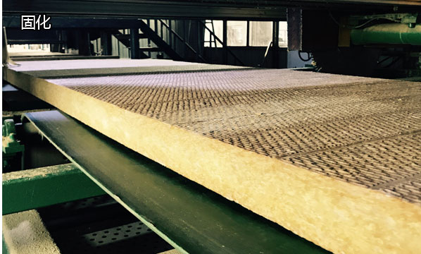 由履带将布好的岩棉传送至压力设备中,使其形成一定密度的岩棉板,经高温烘干炉,使喷吹到岩棉里的高效粘合剂将岩棉粘合为一个整体,岩棉板经高温烘干后,送至冷却出风口使其冷却固化后再经履带传送至切割设备中,根据要求切割成规格产品。